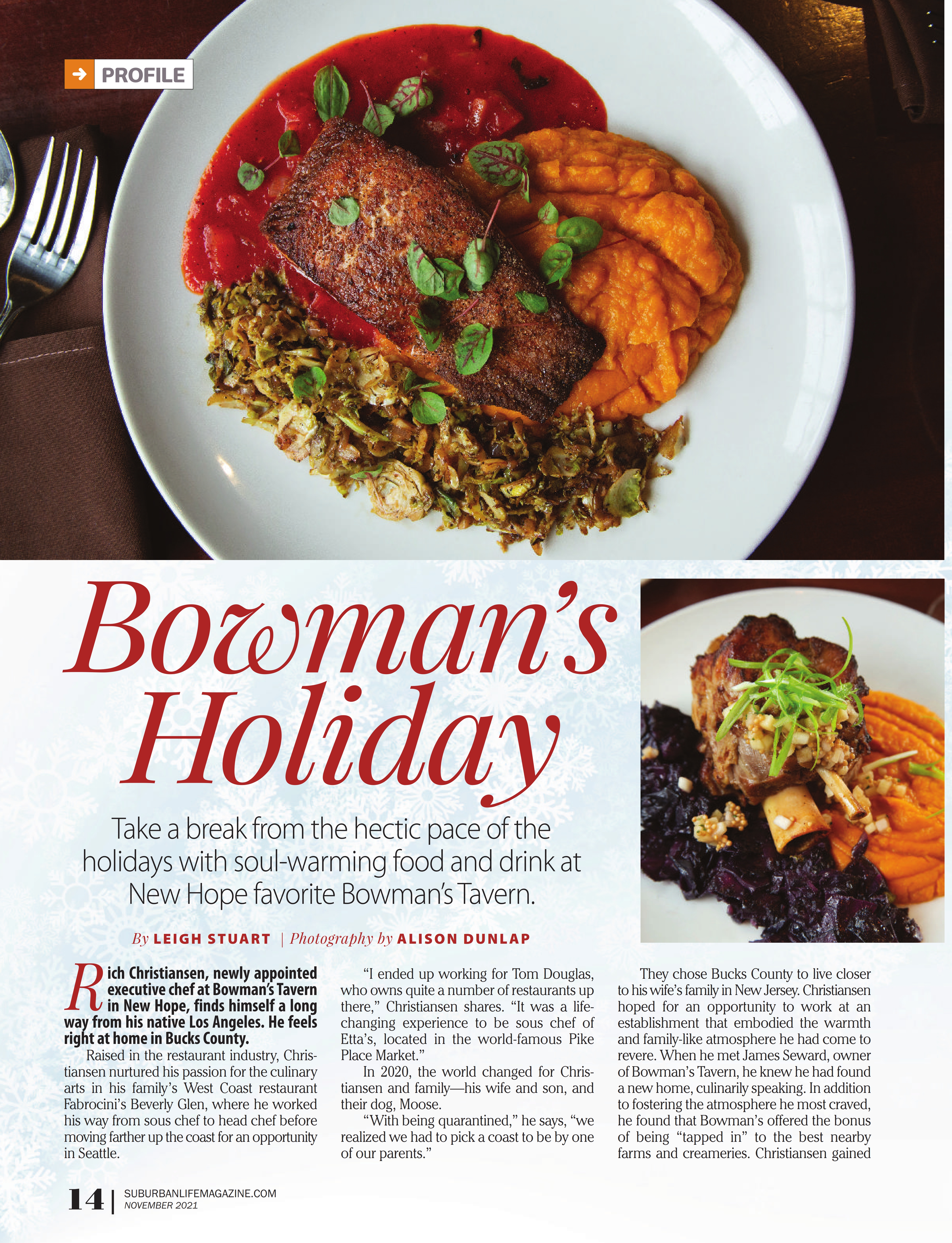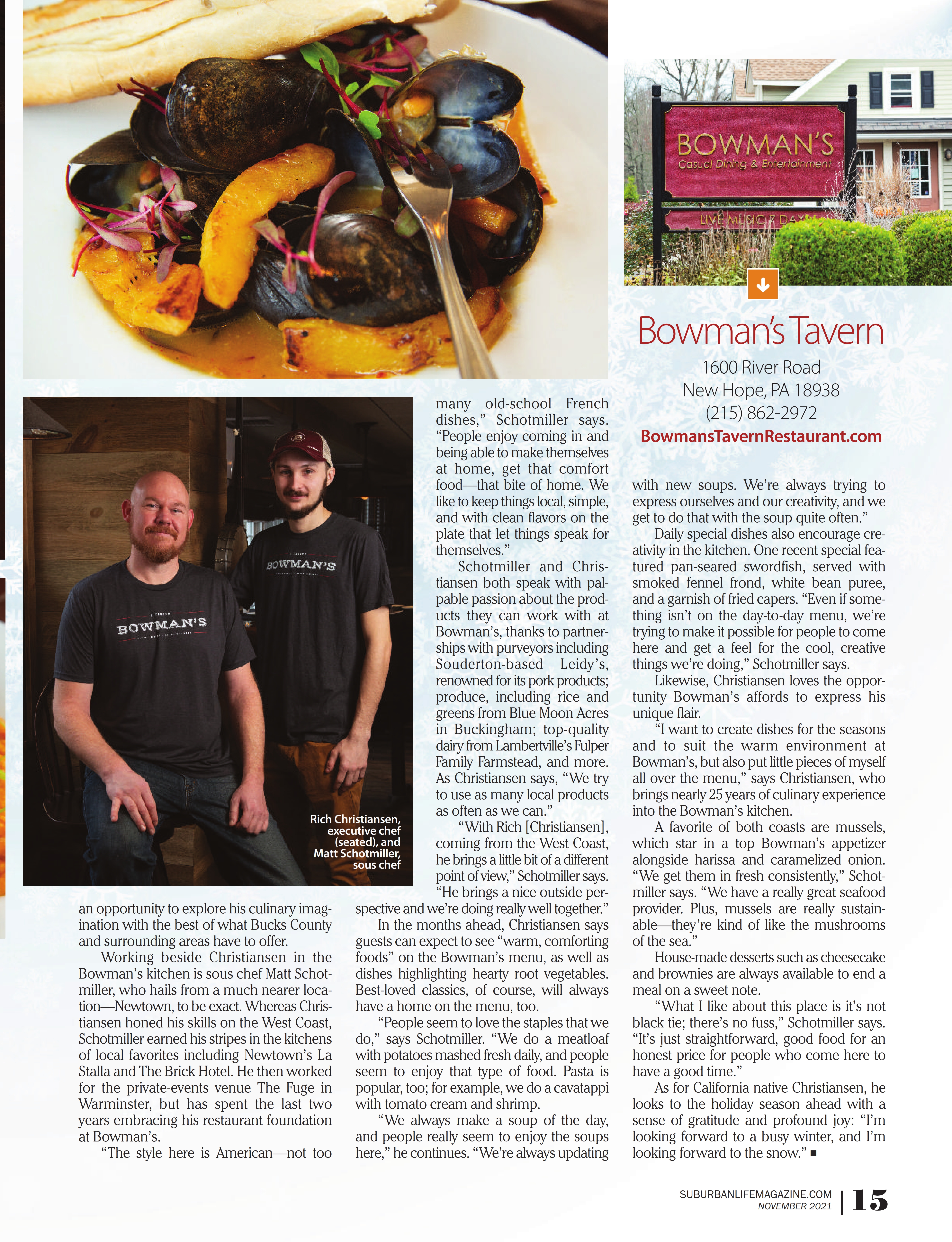 Bowman’s Holiday: Take a break from the hectic pace of the holidays with soul-warming food and drink at New Hope favorite Bowman’s Tavern, Nov. 2021
