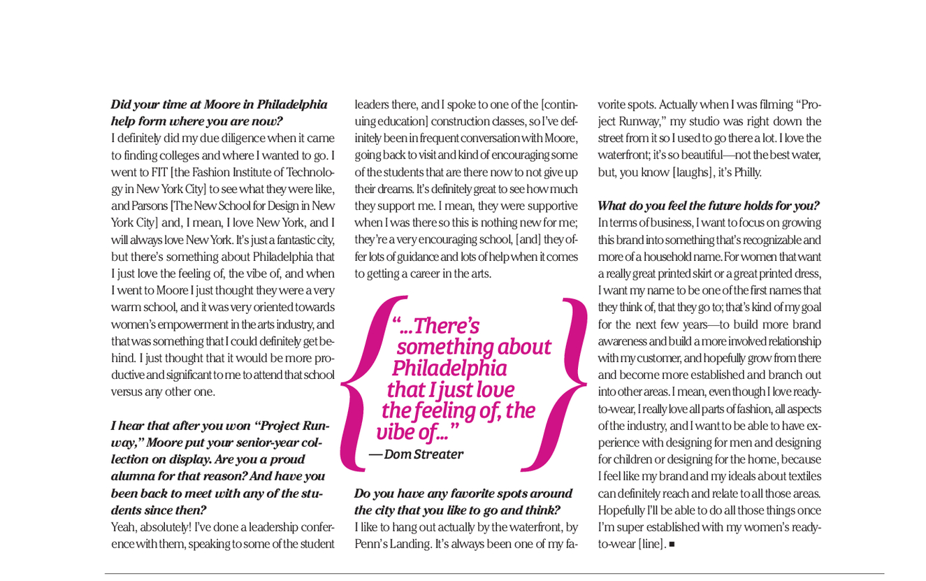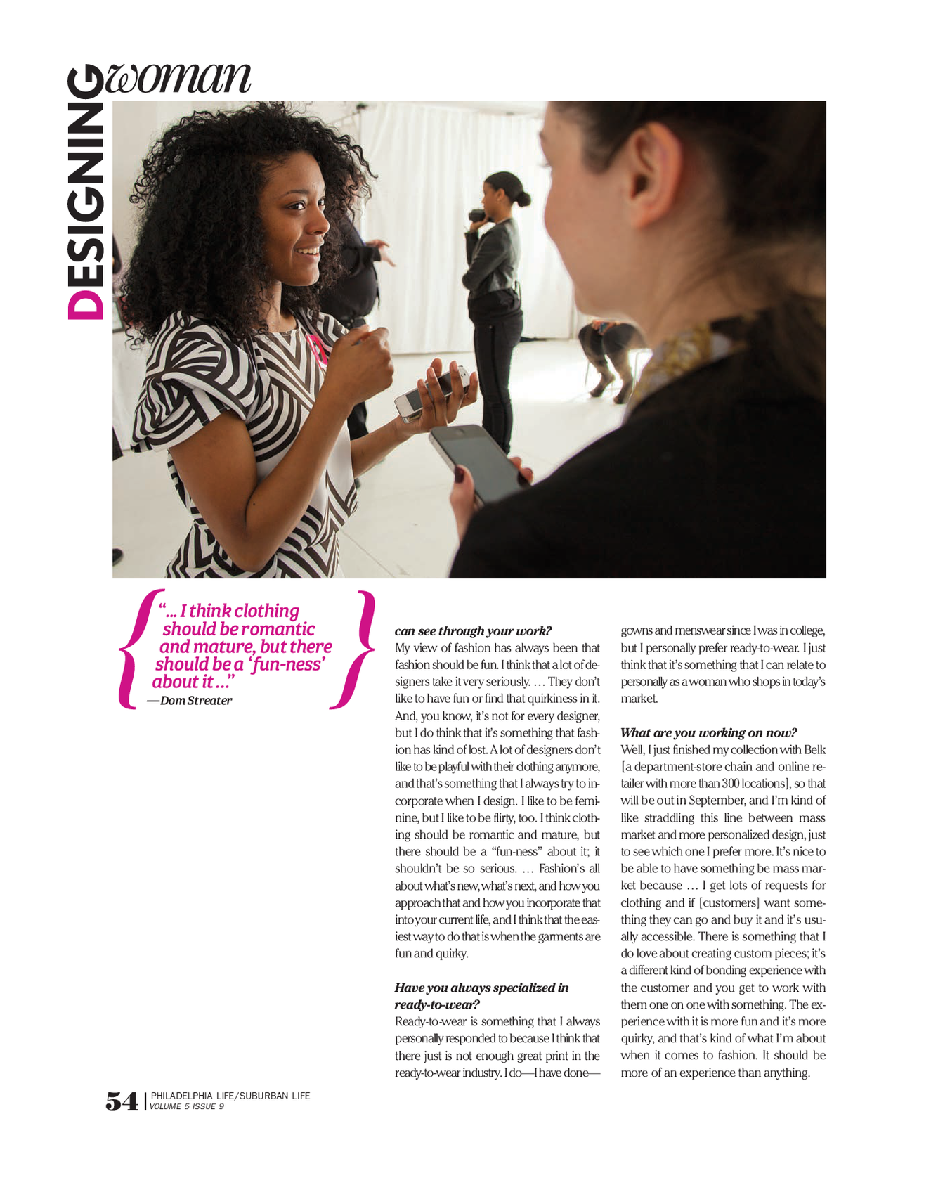 Designing Woman: Fresh off her Project Runway win, Philadelphia fashion phenom Dom Streater has designs on a new goal–becoming a household name, May 2014